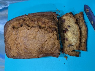 grease pan/flour/parchment paper it, which ever you prefer. Chop up dates and berries (such as cranberries) into tiny bits as well as smash you bananas. Take your hot water and put in the chopped up fruits and baking soda, mix and let cool. Combine butter, brown sugar till smooth then add in eggs and vanilla and mix. Add bananas and your fruit water mixture and spoon mix (if use mixer, do it for a couple turns so not to over mix it) Now add the flour, salt, baking powder, Again, do not over mix. After it’s mixed, place it into your pan and bake. Depending on your oven, time may vary. I used my Ninja air fryer oven on Convection, and it used all the time. It may look done, but due to thickness of bread, check the center. It does get brown and still had 10 minutes, so just watch it. Hope it turns out for you all. Enjoy,